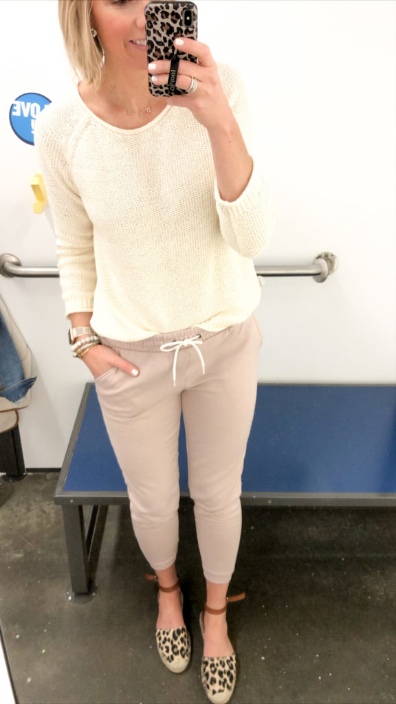 A jogger is a good pant to have in your seasonal closet for weekend wear, or lounging around the house. It’s nice to have a super comfortable option in your closet for those days you just want to be cozy! But this color (blush) & style jogger can easily be worn as an everyday pant too. Pair them with sneakers for an athleisure wear look, or add a pair of loafers to dress them up a bit. See sweats can be chic.
